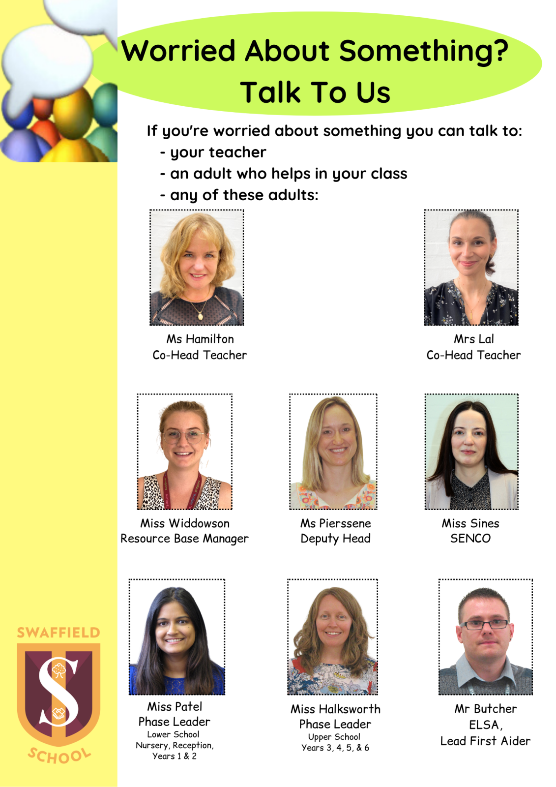 Whilst safeguarding is the responsibility of every adult working in and connected with our school, we signpost to children some of our key members of staff as people who are available for children to talk to.